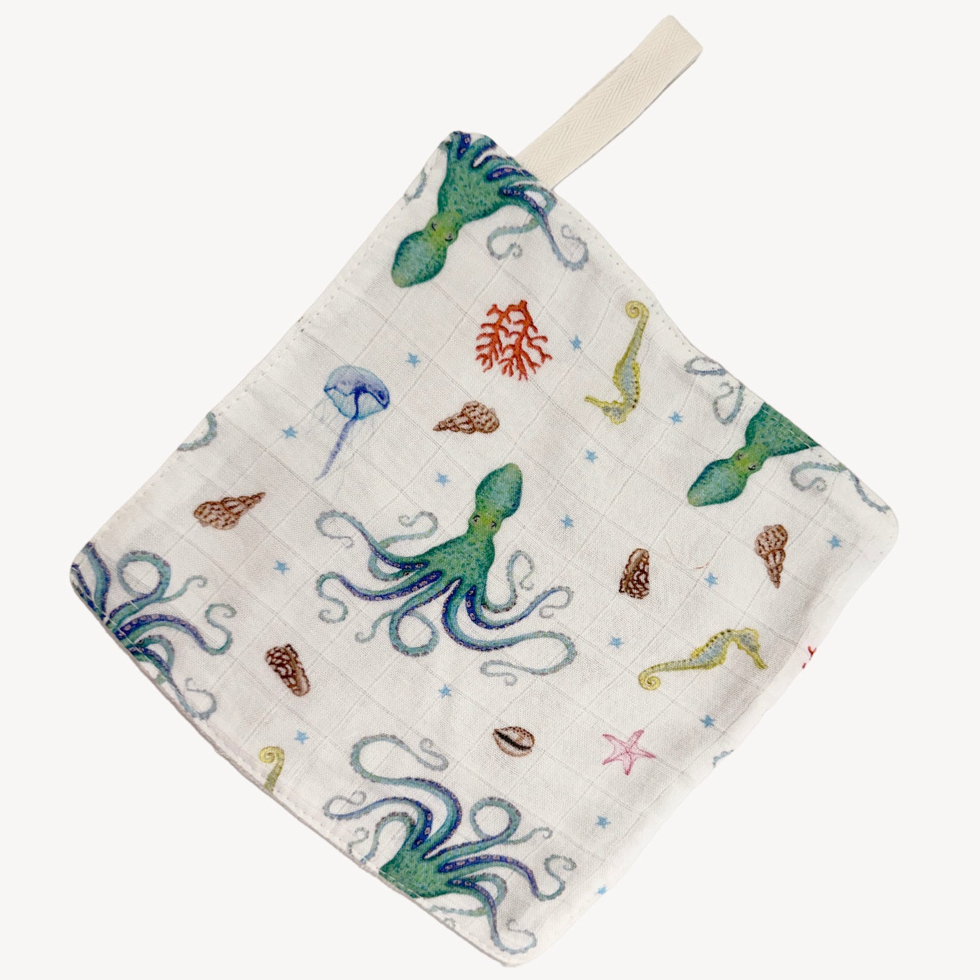 Dit lieve speendoekje is gemaakt om te knuffelen! De zomerse octopus print is geschilderd door Mies met aquarel.