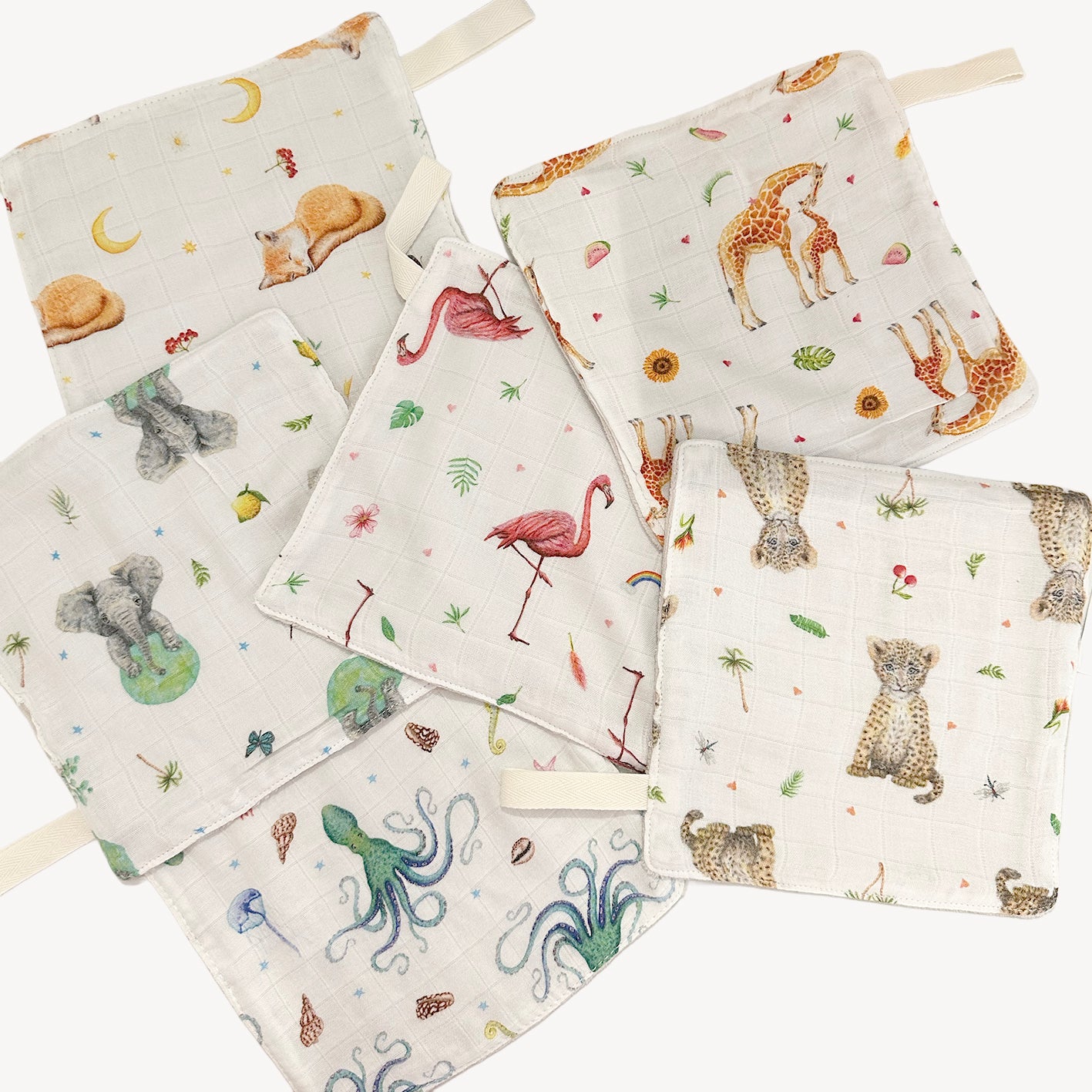 Het doekje is van superzachte hydrofiele stof met 70% bamboetextiel en 30% organic cotton, gecombineerd met heerlijk beige velours op de achterkant. Het formaat is ongeveer 21x21 cm met een lus waar de speen of bijtring aan gehangen kan worden.