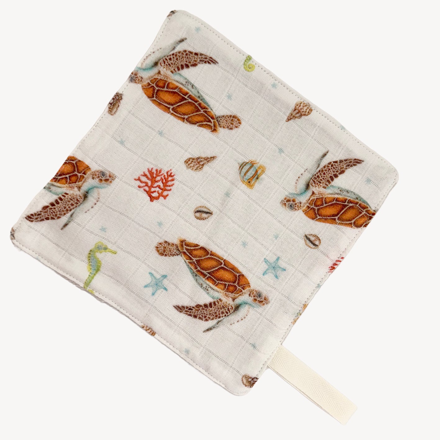Dit lieve speendoekje is gemaakt om te knuffelen! De zomerse zeeschildpad print is geschilderd door Mies met aquarel.