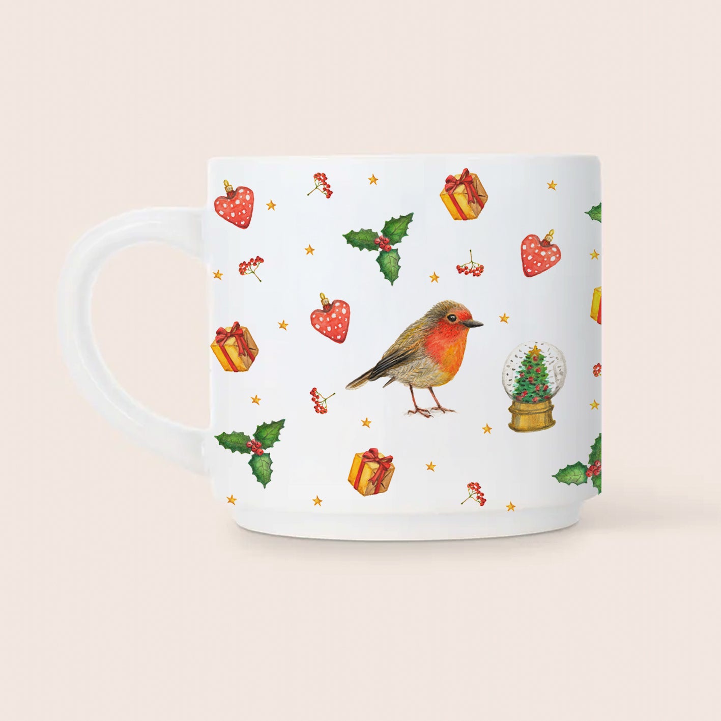 Make the holidays extra cozy with this nostalgic Christmas mug! This ceramic mug is printed all around with hand-painted designs by Mies: a rabbit, robin, mouse and cute Christmas decorations such as holly, red Christmas sticks and stars. Do you also get such an appetite for Christmas with winter tea, hot chocolate and mulled wine?