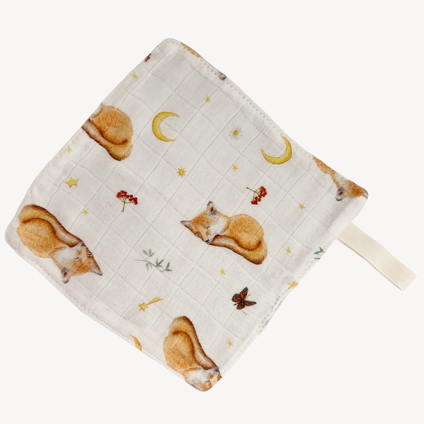The cloth is made of super soft hydrophilic fabric with 70% bamboo fabric and 30% organic cotton, combined with lovely beige waffle fabric on the back. The size is about 21x21 cm with a loop where the dummy or teething ring can be hung.