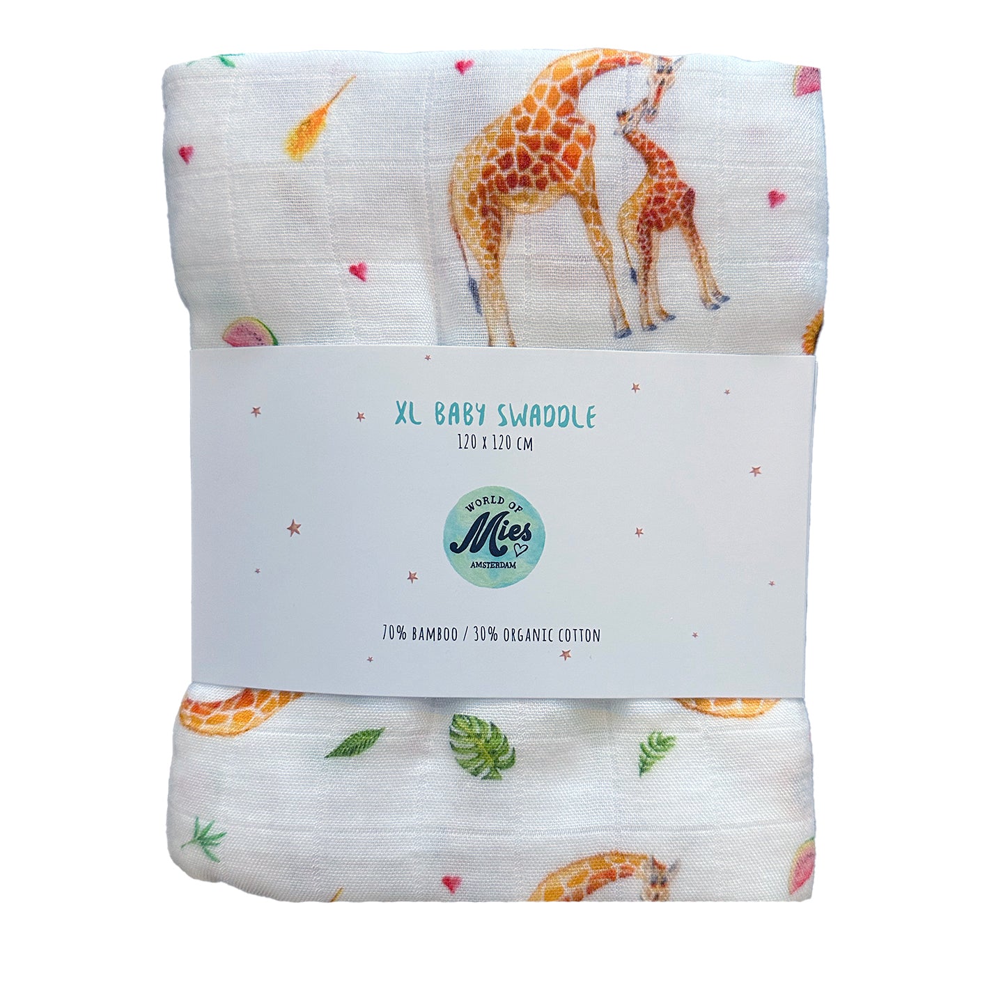 Super soft XL hydrophilic cloth / baby swaddle with cute giraffe mama and baby pattern. The pattern is painted by Mies with watercolour. Very nice to give as a maternity gift to a newborn baby or during a babyshower. Or to give yourself something unique for your own baby equipment. This handy cloth is multifunctional, it serves as a towel, changing mat, play mat, sunshade on your pram, picnic blanket and pad.