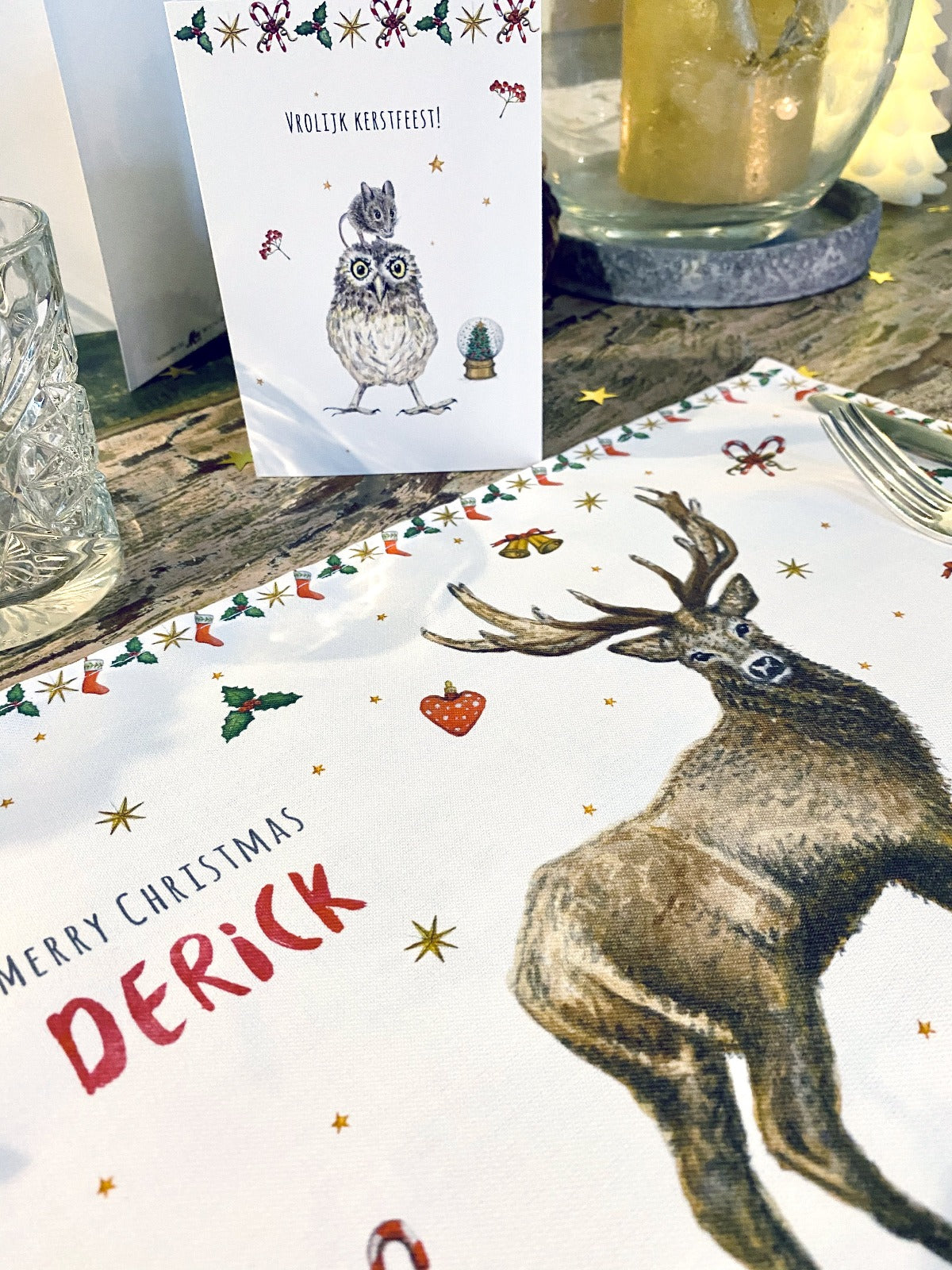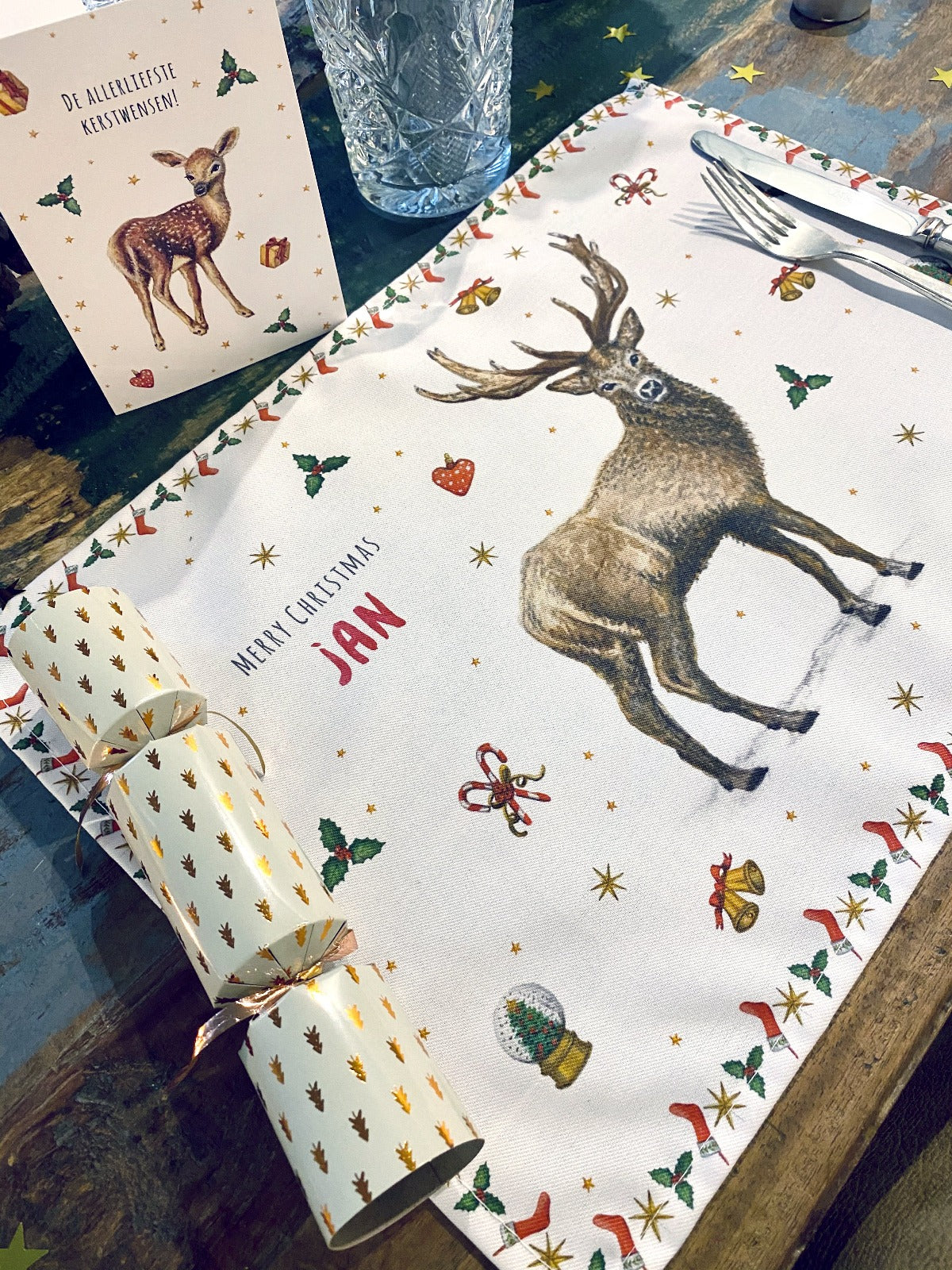 Maak kerstmis extra cosy met deze gepersonaliseerde placemats met hert en traditionele kerstdecoraties. Gezellig met familie of vrienden aan het kerstdiner, hoe speciaal als iedereen z'n eigen placemat heeft! Ook super origineel om cadeau te doen aan dierbaren die je misschien niet ziet deze feestdagen.